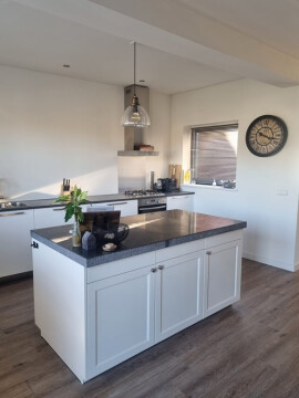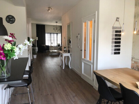 Entrance, hall with cloakroom, modern toilet, kitchen (with dishwasher, oven, 4-burner gas stove and extractor hood), access to the roof terrace and living room. The entire house has a tasteful wood look PVC floor.