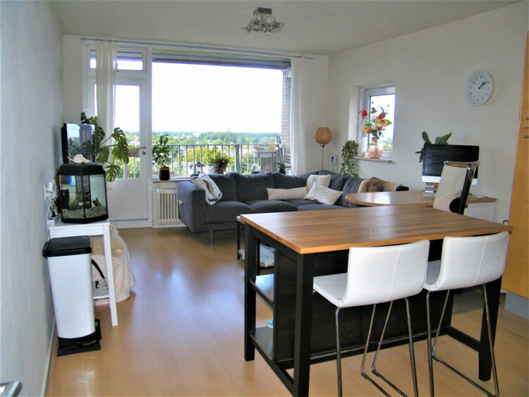 Vanuit de woonkamer prachtig weids uitzicht over de omgeving, . Het appartement is vanwege de hoge ligging erg licht en voelt daardoor ruim aan.