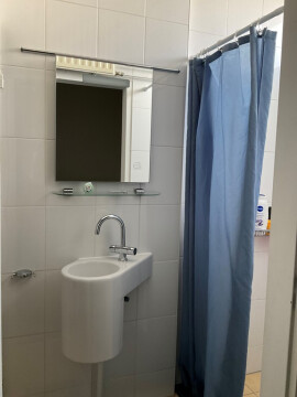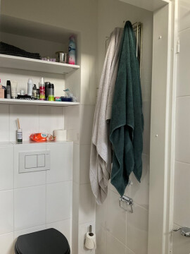Gezamenlijke entree, deur naar de woonkamer met open keuken. Slaapkamer en badkamer.
